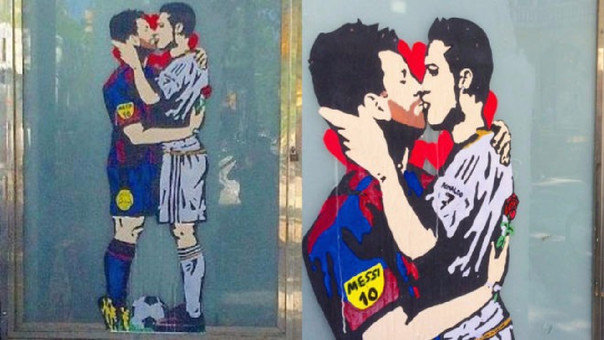 Un grafitti con la imagen de los astros del Real Madrid y Barcelona, Cristiano Ronaldo y Lionel Messi, respectivamente, sorprendió a los habitantes de Barcelona, quienes reaccionaron entre las risas y las críticas.