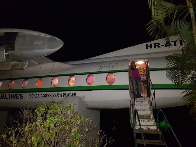 Los asientos del avión que una vez transportaron viajeros de la aerolínea hondureña de Atlantic Airlines, sirven hoy de butacas para los comensales. El disfrute gastronómico en este curioso lugar es sin duda toda una experiencia diferente. Además se ha restaurado la cabina, foto obligatoria para todos los que le visitan.